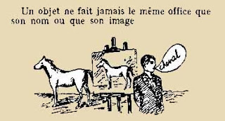 A problem to the solution of which I applied myself over a long period was that of a horse. It was the idea of a horse carrying three figures. Their significance became clear only after a long series of trials and experiments. First I painted a jar and a label bearing the figure of a horse and the letters: ‘Confiture de Cheval’ (Horse Jam). I next thought of a horse whose head was replaced by a hand, with its index finger pointing forward. But I realized that was the equivalent if a unicorn…